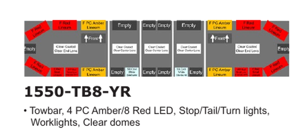 | 1550-TB8-YR | 58", 4 PC Amber/8 Red LED, Towbar, stop/tail/turn lights, worklights, clear domes |